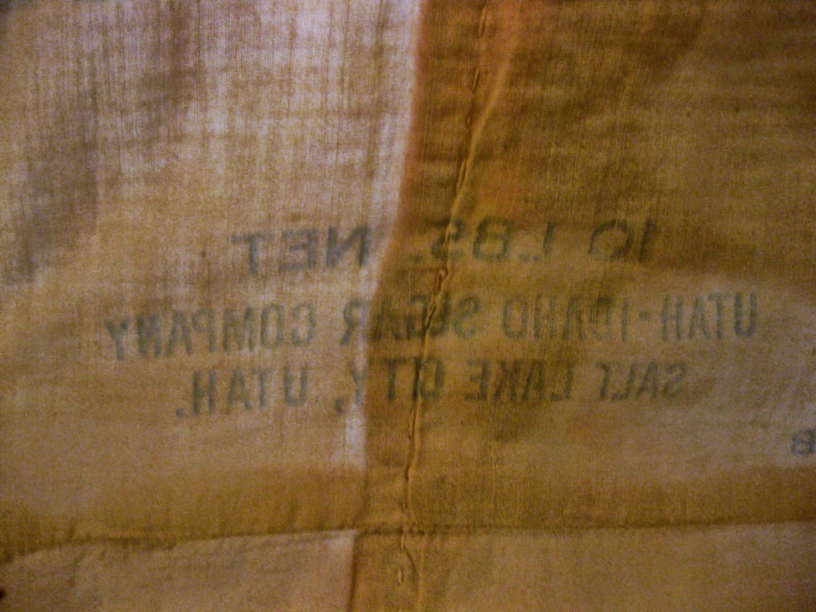 But I think the coolest part of my re-discovery of this old friend was a chance glimpse, while I was folding it up with a light behind it, of writing turned to the inside-wrongside of the quilt, which I'd never noticed before despite inspecting the top fabrics numerous times. Before this fabric was used as quilt backing, it was sugar sacks - best I can figure, there are three different feedsacks used to create the back, all of which appear to be 10 lb bags of sugar from different manufacturers: the Utah-Idaho Sugar Company in Salt Lake, the American Crystal Sugar Company in Mason City, Iowa, and the Amalgamated Sugar Company in Ogden, Utah. I'm assuming this means that some or most of the top fabrics are also feedsacks.